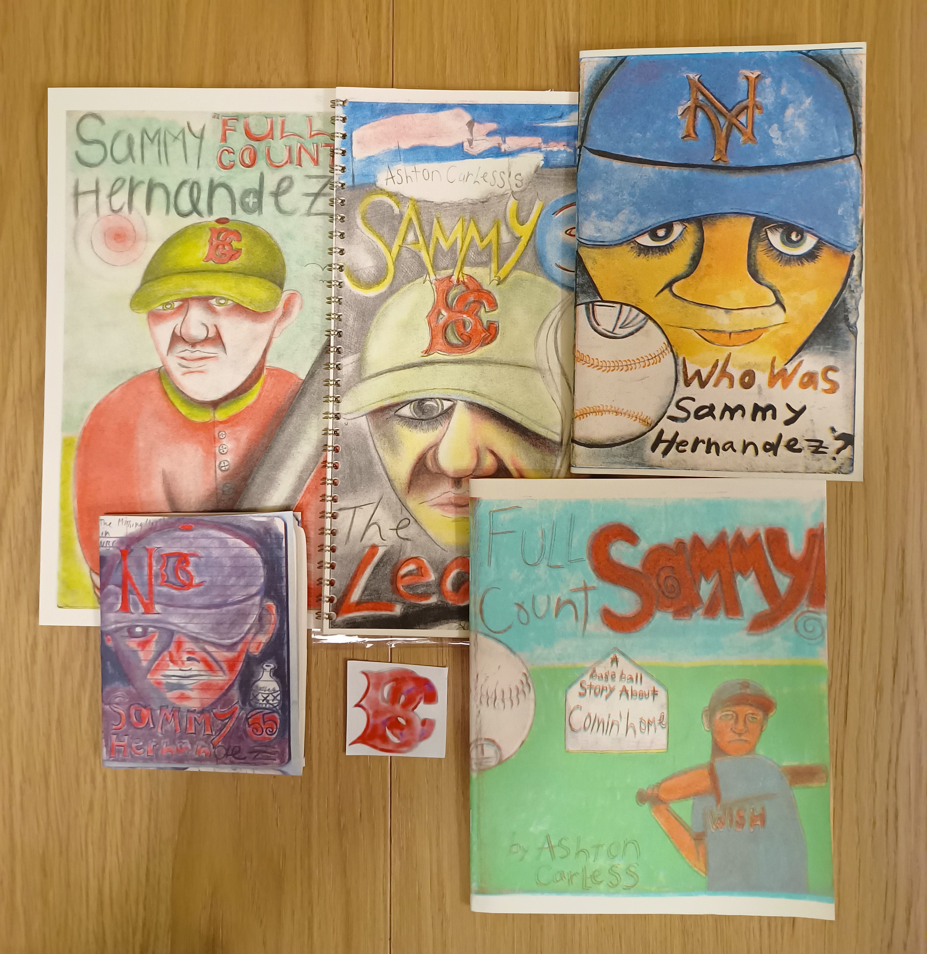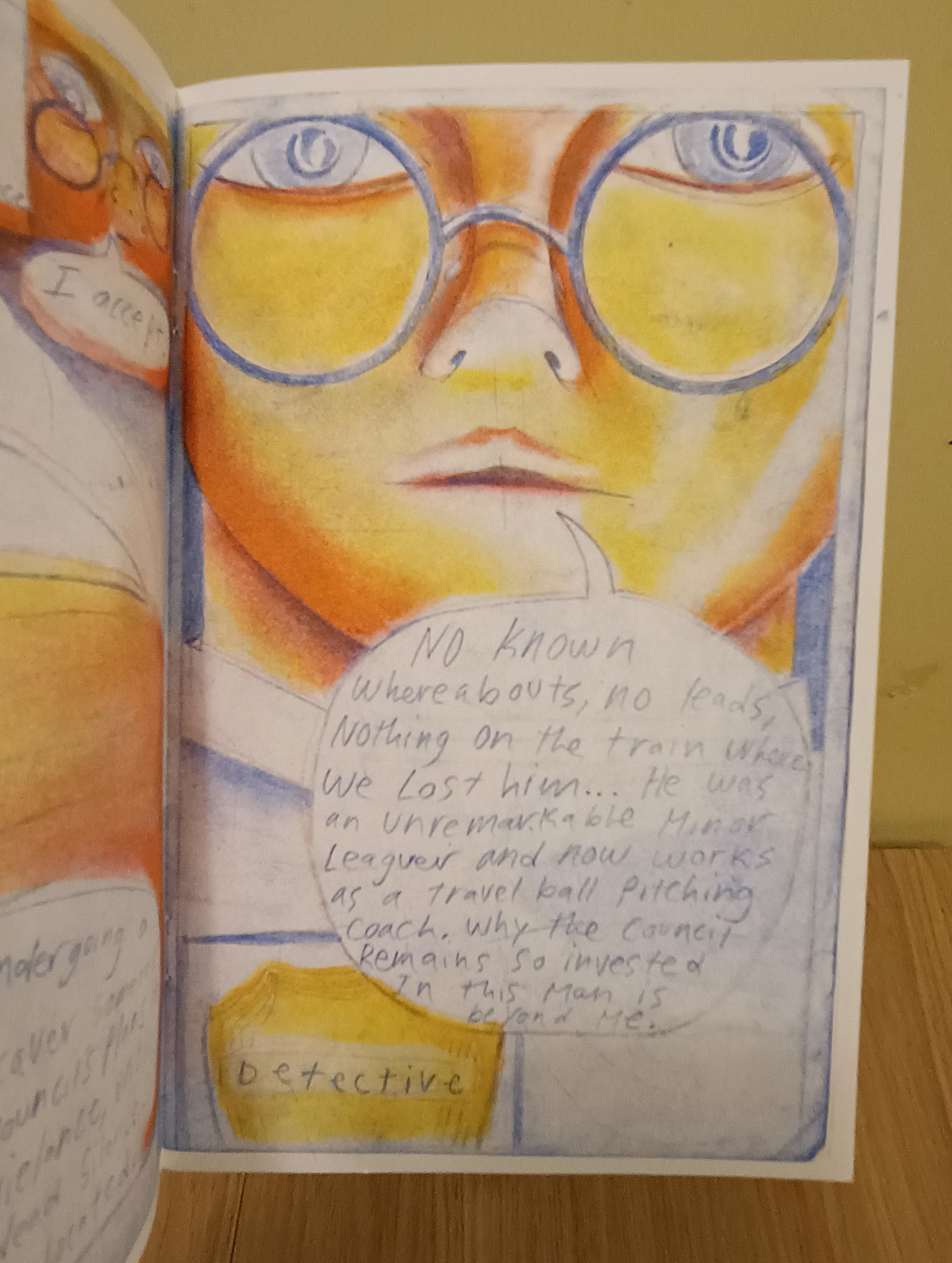 Ma veniamo all’argomento di questo post, che è anche uno degli oggetti più belli prodotti da questa nuova scena newyorkese, ossia una busta formato magazine che contiene all’interno tre albetti di diverse dimensioni (due spillati e uno rilegato con la spirale), un poster-fumetto pieghevole, una stampa, una trading card e un mini-adesivo, tutti realizzati e stampati in risograph da Carless tramite il suo marchio Bootleg Books, con cui ha prodotto nuove versioni di fumetti altrui (esistono dei bootleg anche di alcuni numeri di Cowlick, per dire) o pubblicazioni ex novo. Non è subito chiaro in quale ordine leggere i fumetti, dato che l’indice è alla fine, ossia sulla terza di copertina di Sammy 3 – The League. In ogni caso viene spontaneo iniziare con Who Was Sammy Hernandez?, domanda che vi starete ponendo anche voi e allora, se già prendendo in mano la busta si capisce che il protagonista ha a che fare con il baseball, da questo primo albetto capiamo anche che Sammy è sparito. La notizia ci viene data dal narratore, un detective occhialuto a cui viene assegnato il caso, ossia il compito di ritrovare questo ex giocatore di baseball delle leghe minori finito a fare l’allenatore dei lanciatori. Un personaggio che non sembra di primo piano, ma che invece per qualche motivo sta particolarmente a cuore alla città di New York, tanto che il consiglio comunale lo teneva d’occhio sin prima della sua sparizione.